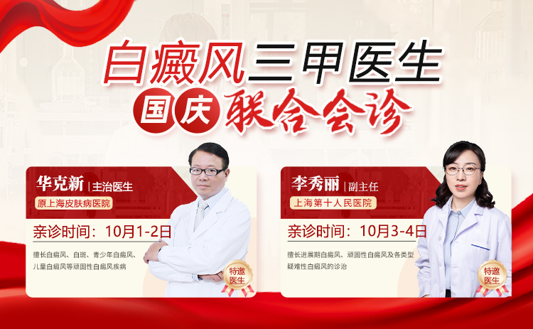 10月1日—2日,诚邀原上海皮肤病医院主治医师 【华克新医生】;10月3日—4日,诚邀上海第十人民医院副主任 【李秀丽医生】;双节同庆,特邀三甲医生团队到院,携手我院白癜风主任。共同应对秋季常见白癜风皮肤问题,做好秋季白癜风防治工作。